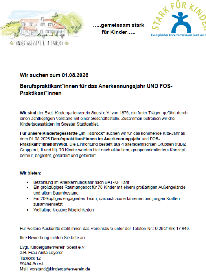 Wenn Sie Interesse an unserer Einrichtung haben, melden Sie sich gerne unter 02921/8800 oder per mail an tabrock@kindergartenverein.de